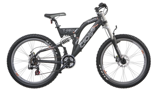 Велосипеда на Cross T-Rex се превърна за много кратко време в хит на вело-пазара. Маунтинбайк в пълният смисъл на думата! Колелото просто няма слаб детайл. Алуминиева рамка с full suspension, или по нашенски казано с меко окачване с амортисьор. Здравата, също така амортисьорна вилка downhill Zoom СН – 650DH гарантира много приятно спускане и по най-неравните склонове като осигурява ход от 100 mm. Скоростите разбира се Shimano EZ-fire Shift/Brake levers ST-EF60-7/ RD-TX70 са общо 21 на брой. Джантите са алуминиеви двустенни тип 9х4 и обути с гуми Tioga, които ще ви гарантират отлично поведение и в най-калните терени. Велосипеда е оборудван с предна и задна механични дискови спирачки Promax DSK320. Невероятен, мускулест и много агресивен байк, чието име T-Rex идеално пасва на характера и визията му. Цялата моделна гама велосипеди за 2010 на Cross можете да намерите в магазините на Escadra Bulgaria в София, Варна, Пловдив и Бургас.