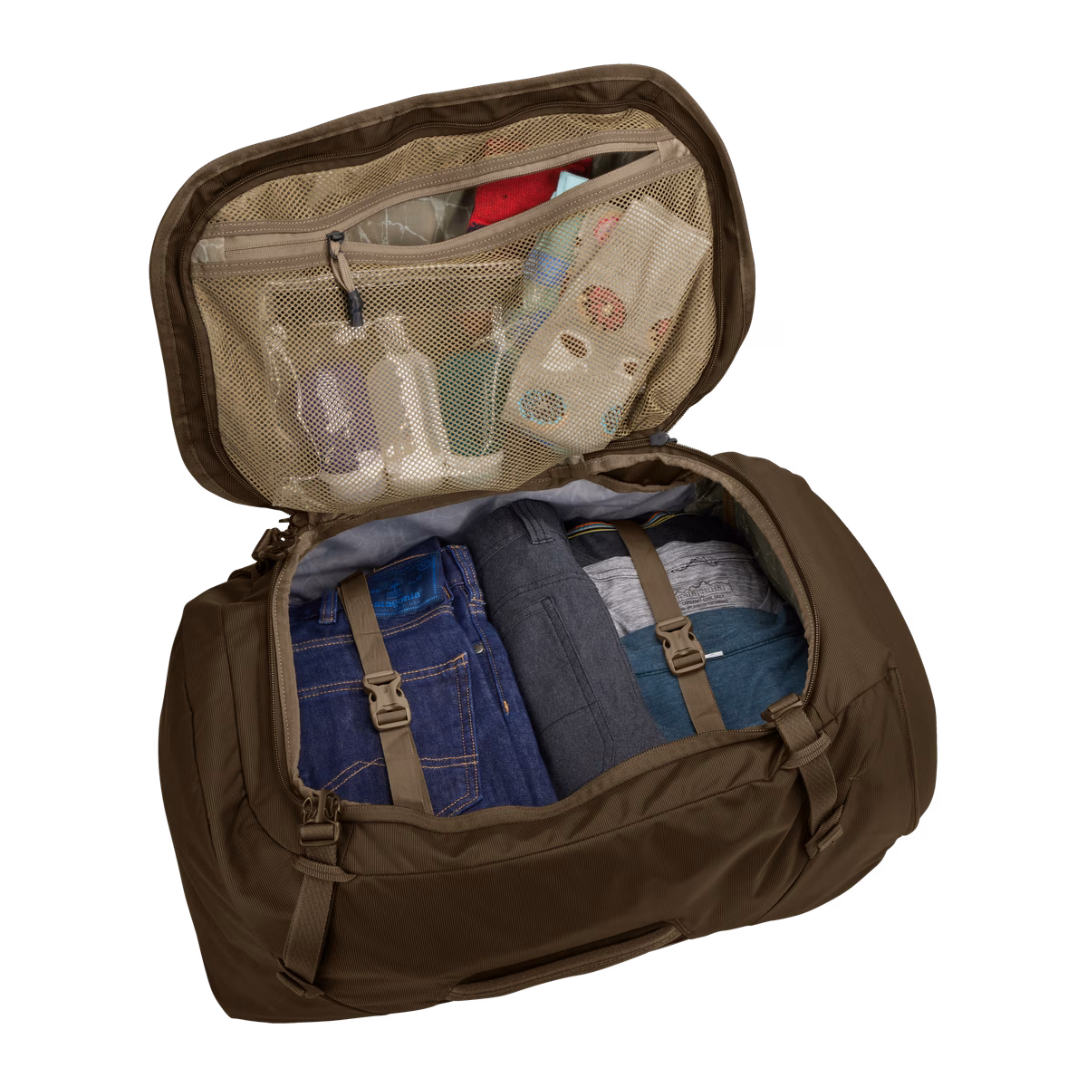 - Принадлежностите се държат сигурно на място и са организирани с вътрешни компресионни ремъци и мрежести джобове за съхранение