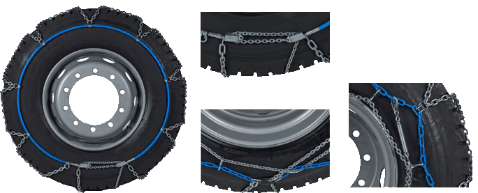 Големият брой брънки позволява непрекъснато сцепление. Обикновената кръстосана верига с кръгло напречно сечение от 6,00 мм предлага най-добрия баланс между производителност и комфорт при шофиране. Системата за монтиране позволява монтирането на автобуси с ограничено място и двойни колела без повдигане на превозното средство.