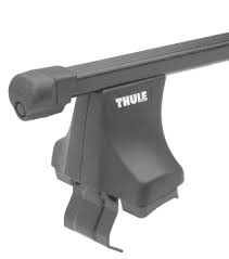 Стандартни здрави метални греди за багажник на автомобил Thule Square Bar с основа Rapid System 750 и дължина на гредите от 108 до 150 см.